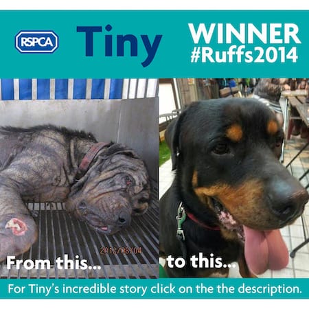 Rescued from a kill pound grossly undernourished and riddled with mange, Tiny the Rotweiler's incredible transformation makes him an online dog-show champion.